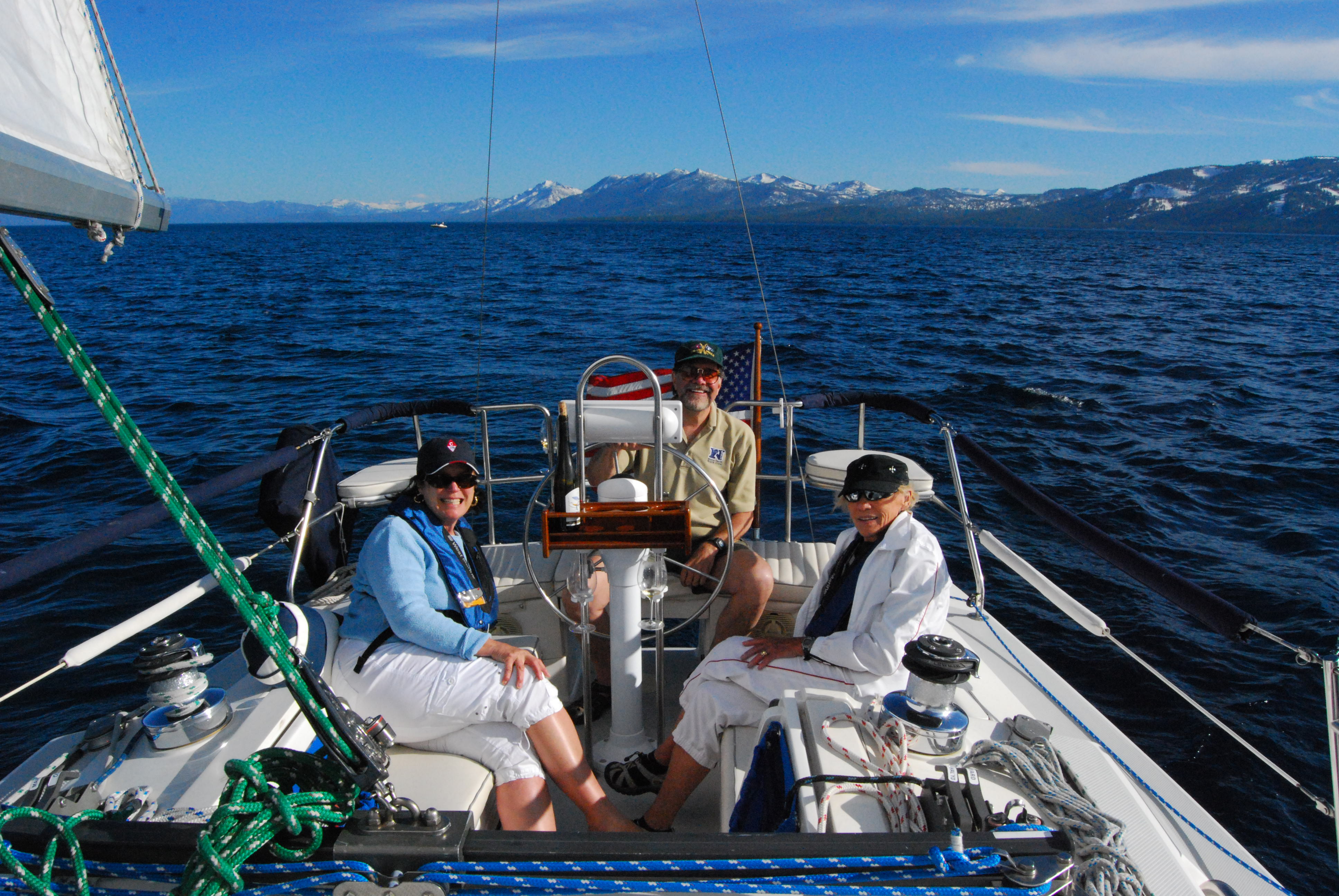 On Sunday, June 12th, we celebrated our dear friend Pam Shriver’s birthday aboard Splendido. Pam and her husband Bob are our longtime friends and traveling companions, seasoned survivors of many wine country excursions and even weeks abroad in Provence. Debbie prepared some French Laundry-style buttermilk battered fried chicken and a zesty new potato salad, followed by chocolate cupcakes with a vanilla bean ganache. The trio shown here downed an able-bodied seaman’s share of Chardonnay and Pinot Grigio, while yours truly stayed sober and kept all the lines and sheets in order as we sailed in large circles, lazily following the light and variable winds. To her credit, Splendido managed a respectable 6.1 knots at her peak. The day turned out to be a little warmer than expected, and a good time was had by all. At the end of our day, the stern-wheeler Tahoe Gal had anchored near our buoy and had a band playing on board, so I had to chase off a poaching spectator boat off our buoy at Tahoe City Marina so we could put Splendido to bed. Note to self: Prepare a quantity of water-balloons for future encounters with thoughtless buoy poachers.