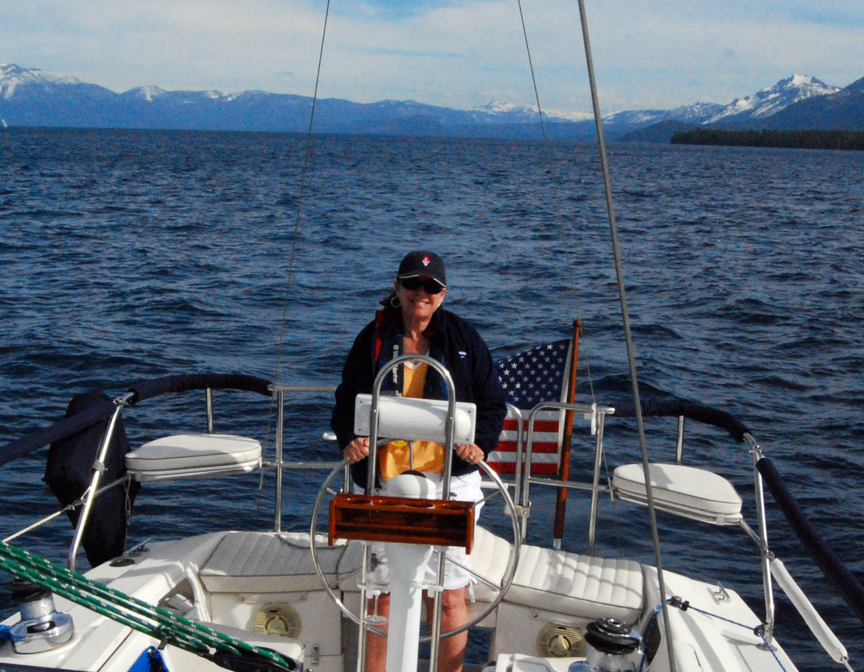 Debbie_6.18.11_SplendidoWe’d been looking forward all week to getting out on Splendido on Saturday, June 18th. The wind started kicking up around 1:30 p.m., so we hoisted sail and headed for Sugar Pine Point. We hadn’t gone 200 yards when I saw catspaws ripping across the water, indicating a major gust. I told Debbie to hold on, and I headed up, but not before a pretty surprising heel. Debbie had had a tough week, and she was looking forward to relaxing with a glass of wine while I steered, but it wasn’t meant to be on this particular Saturday. Before long, we were both working hard, putting a reef in the mainsail and using just a sliver of the jib to keep things stable and enjoyable in the strong gusts. The gusts moderated a bit in the later afternoon, so we could relax a bit more, but the day ended up being a bit of a nailbiter, all in all.