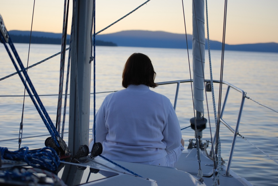 About 5:30 a.m., I got up, and the beauty of Rubicon Point took my breath away. Debbie was meditating with a cup of fresh French-pressed coffee on the bow.