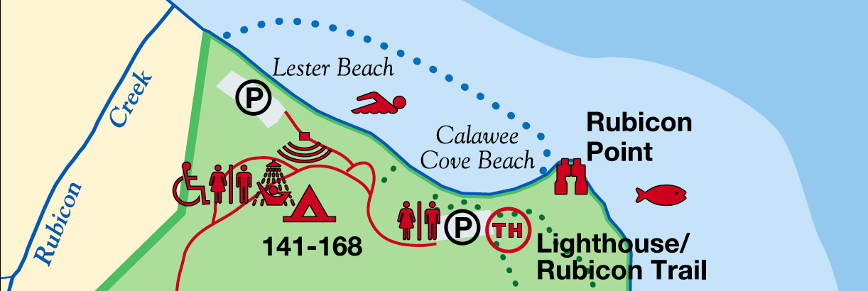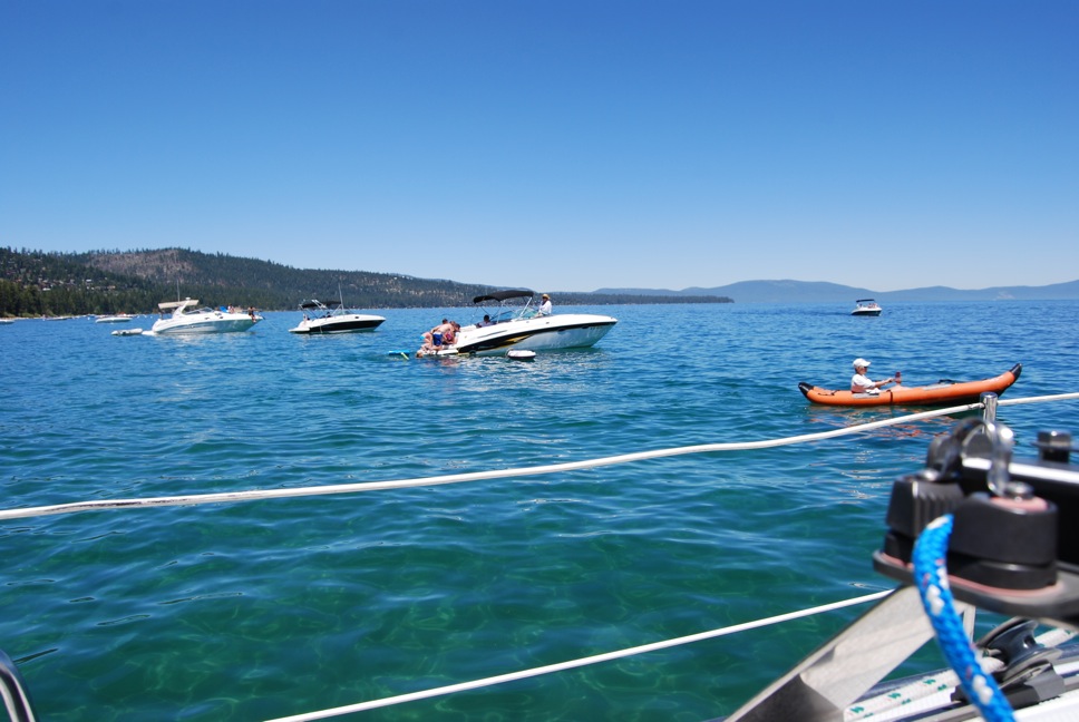 With the Fourth of July weekend upon us, Debbie and I snuck out of work early on Friday and headed up to Lake Tahoe for an overnight stay. We were both a little nervous about staying the night “on the hook” for the first time, but I had spotted a neat little half-moon beach called Calawee Cove at Rubicon Point that I thought would protect us from west and southerly winds, so we went for it.