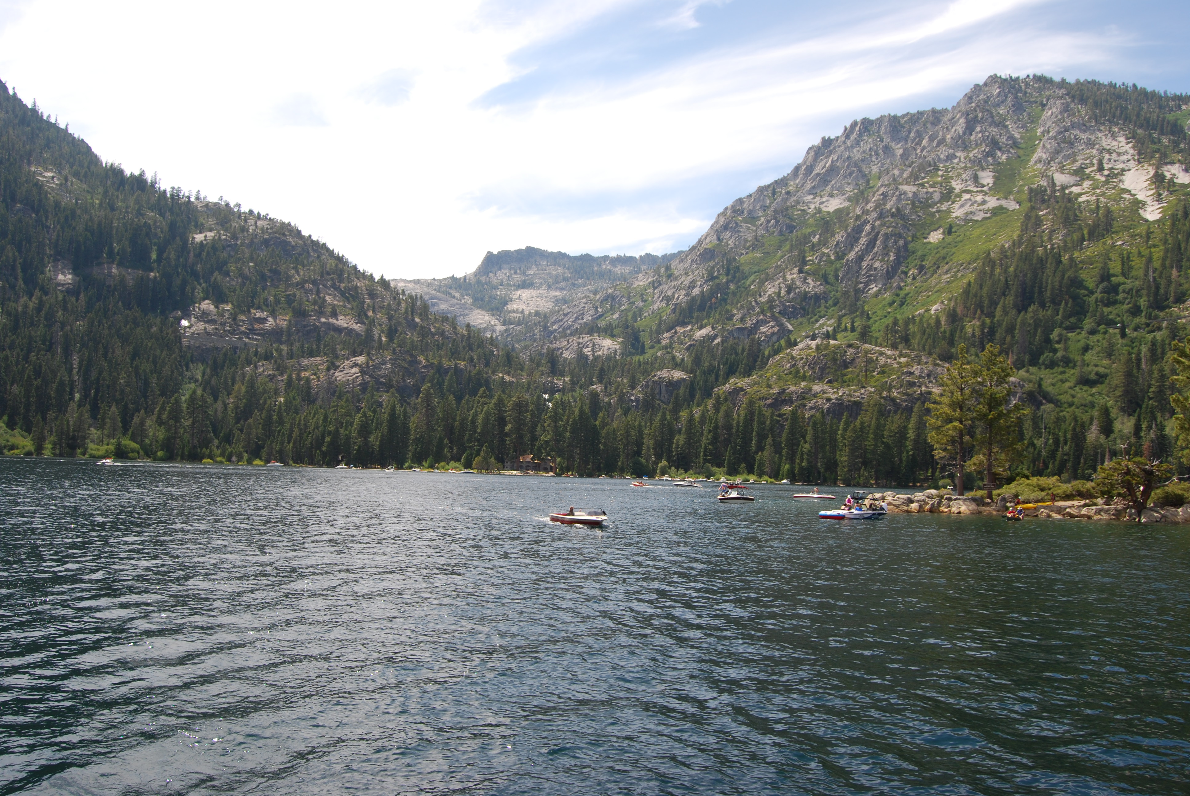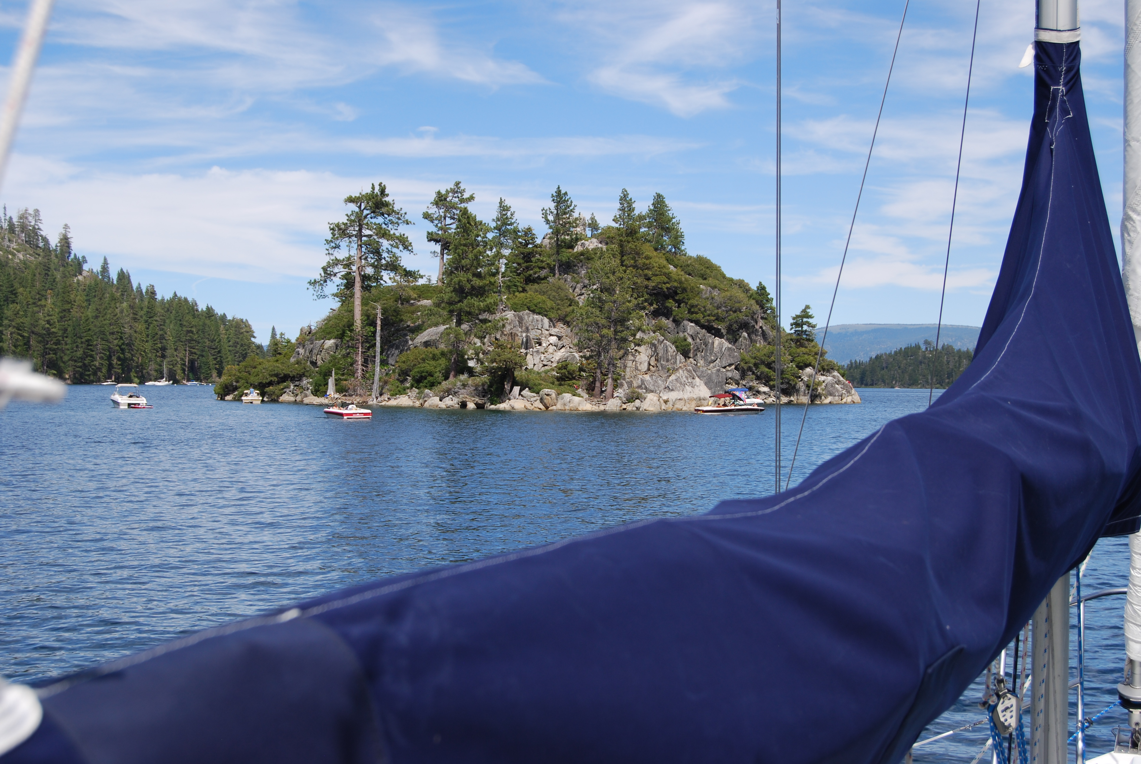 I’ve always wanted to spend the night on the boat in Emerald Bay—probably the most popular destination for boaters and sightseers at Lake Tahoe—and on Friday, August 12, Debbie and I went for it. We got up to Tahoe City Marina quite early, then motored our way the 14.8 miles down the lake to the entrance to Emerald Bay, taking exactly three hours to get there. A narrow channel marked by red and green buoys shows the relatively narrow entrance to the bay, as there is sort of a “sandbar” at the mouth of the cove. The water depth plunges to more than 100 feet within a few minutes of entering the bay.