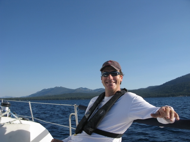 But back to the sailing. Both Phil and I are 200+ lb. guys, so rowing out to Splendido was a bit of a comedy act in our 8′ Walker Bay dinghy. But, with catlike grace and athleticism, we managed to lumber aboard without getting wet. I walked the dinghy forward and tied it off on the buoy and cast us free, where some gentle afternoon breezes took us easily out over toward Chambers Landing. We gobbled up some Subway sandwiches and talked, talked, talked…and then the wind died. Completely. So, we just sort of bobbed around the bay for an hour or so and talked some more, while the sails hung lank and Tahoe began to take on its telltale pinkish hue as the sun got lower and lower. Finally, I turned on the motor and we started back…and the wind picked up! So we had “bookend” winds on this particular outing. They actually picked up pretty good, to the point where we were getting over 5 knots on the gauge and a bit of a heel, too. I made a complete hash of flaking the sail as we drew near to the buoy, so I had Phil make a big circle, which gave me time to tidy things up a bit and dive below for the boat hook. By this time, Phil was an “old hand” with the wheel and throttle, and we made our approach. Phil steered us perfectly to the buoy, then gently hit reverse to stop the boat. I got the mooring line on the first try. It was awesome. Looking forward to more music and sailing magic with Phil in the future!