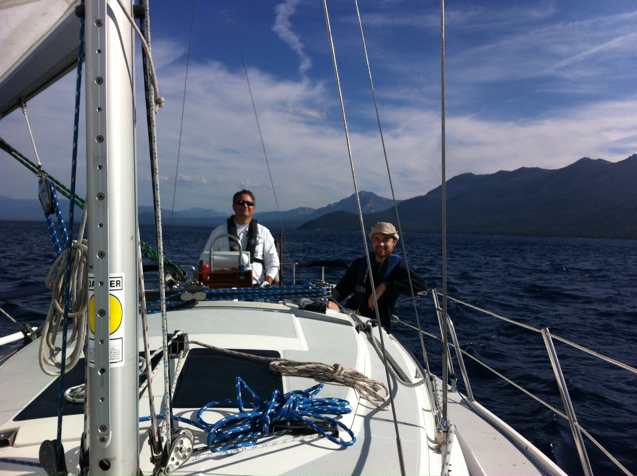 I was so thrashed after seven hours on the water Saturday that I slept most of Sunday, so it was quite a surpise when I picked up my mobile phone in the late afternoon and saw a text from an unknown number that said, “Sailing was great…wish you could’ve joined us!’ with the photo shown here. Immediately, my eyes were drawn to the lovely curves of the Catalina 270’s hull and sugar-scoop transom, the beautifully sculpted cabin and fine entry of her bow. I reflected a bit on how Splendido looks a bit like a bright seagull as she sits bobbing on the swells when I first see her as I round the curve near where she’s moored. I’m always struck by how well the “Captain’s Navy” navy-blue canvas looks against the white hull, whether it’s the lifeline pads or the covers for the wheel, the winches, or the mainsail. I still love the Splendido logo I designed, and which was lovingly hand-painted by my friend Lane Walker, a legend among hand-letterers and sign painters in America. I winced when I noticed how I’d dishonored Splendido by leaving her fenders out on the deck and how I neglected to flemish her dock lines, disrespecting this great beauty with my carelessness. Forgive me, dearest Splendido…I’ll make it up to you with a warm-water bath and organic, biodegradeable boat soap, and equally eco-friendly cleaner wax…the equivalent of a mani-pedi for the other woman in my life, my darling Splendido. As for those other girls, the ones on deck? That’s my lovely niece and her friends, who just happened to be boating by and thought they’d take a happy snap to send to us for some summer fun.