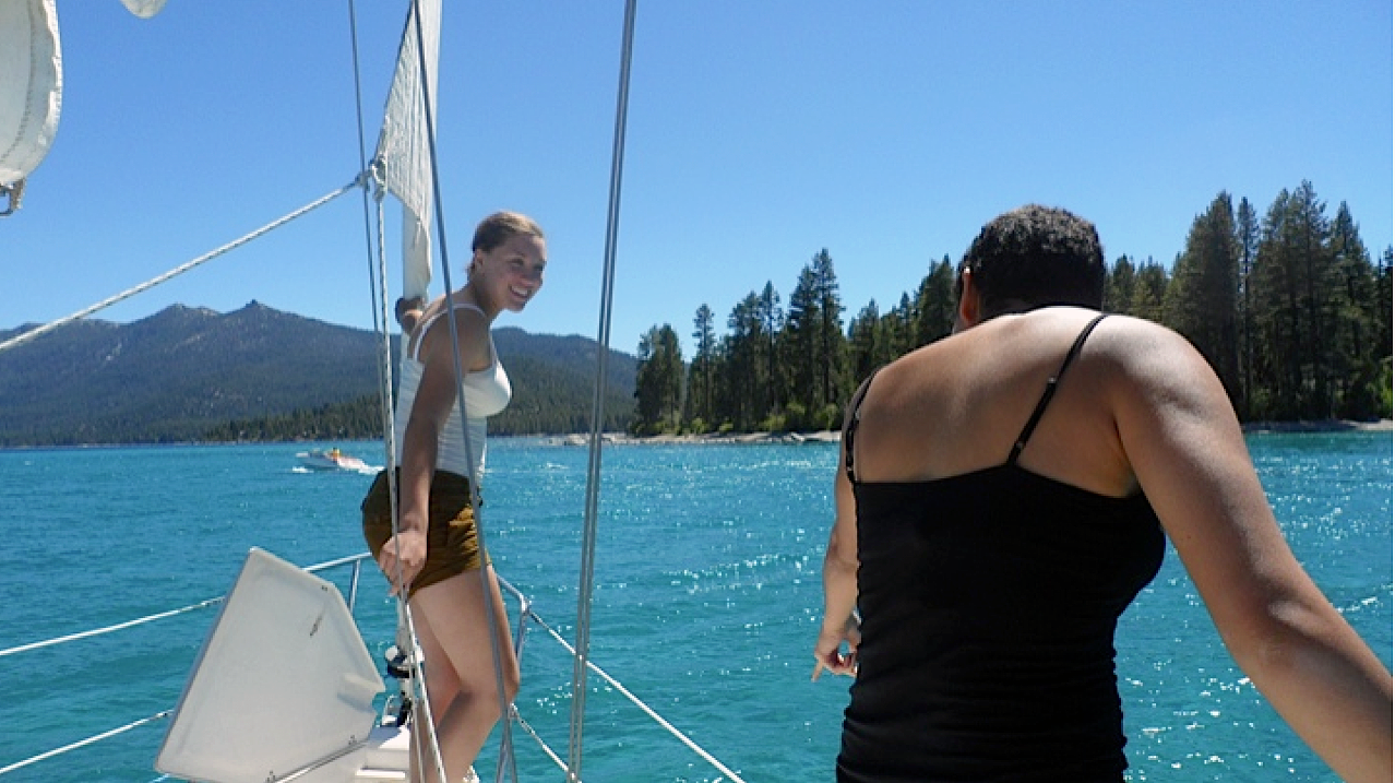 I got a call from an old friend last week — his granddaugher from North Carolina was coming out to visit and would I mind taking them out for a sail? “I’d love to!” I said. So, on Saturday, June 29th, around 1 p.m., my friend Michael, his granddaughter Lauren, and her friend Dominique joined me on Splendido for a fun afternoon of sailing with gentle breezes, warm air temps, and a bit of swimming in Tahoe’s 60-degree waters, too. (A wee bit of swimming…that water is cold!)