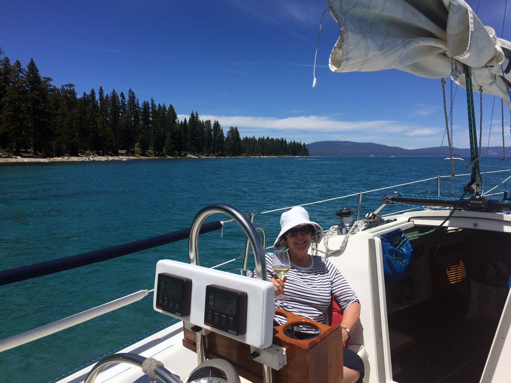 Debbie and I had another lovely sail on Sunday, June 19th … early on, we motored south to the northern edge of Meeks Bay, then threw down the hook in the white sand bottom we enjoy so much at the southern end of Sugar Pine State Park. We were in about 9 ft. of water, and the winds were forecast to be out of the northeast all afternoon, which is unusual for Lake Tahoe. After spending a few relaxing hours just hanging out and listening to Carla Bruni’s Quelqu’un m’a dit CD (perfect for restful listening aboard a gently rocking sailboat), we sailed off the hook and enjoyed the fun, consistent easterly winds on the sail back home.
