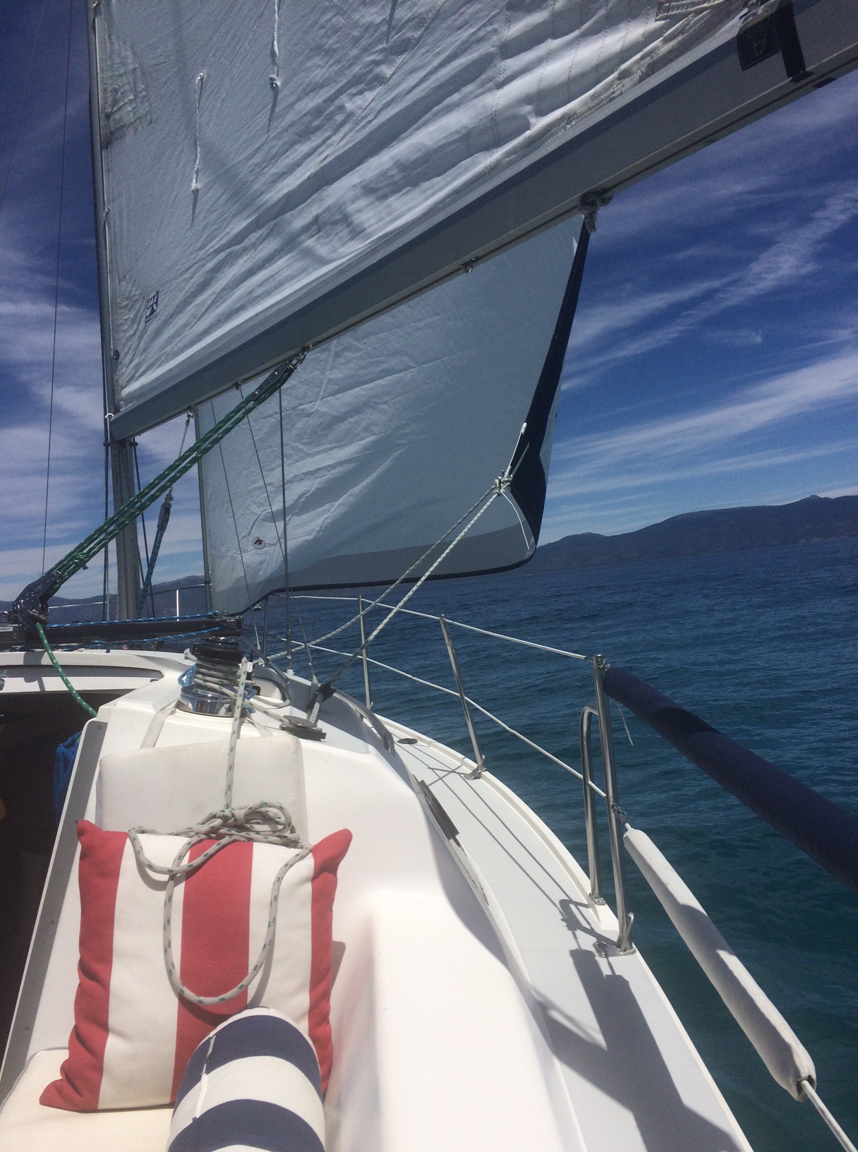 The big news for us this season is a new 150 Genoa from National Sail Supply. Readers may remember me writing that we’d shredded the old genoa last season during the Tahoe circumnavigation. Bottom line, the old 150 genoa didn’t have a sacrificial sun cover, so I suspect it suffered UV damage while on the hook, probably at a much greater rate than other locales where the sun is not so intense. At any rate, ordering the new sail was a snap, and when it arrived, it felt like Christmas. Already, I’m very impressed by the quality workmanship from head to foot, luff to leach, and she pulls Splendido like a dream.