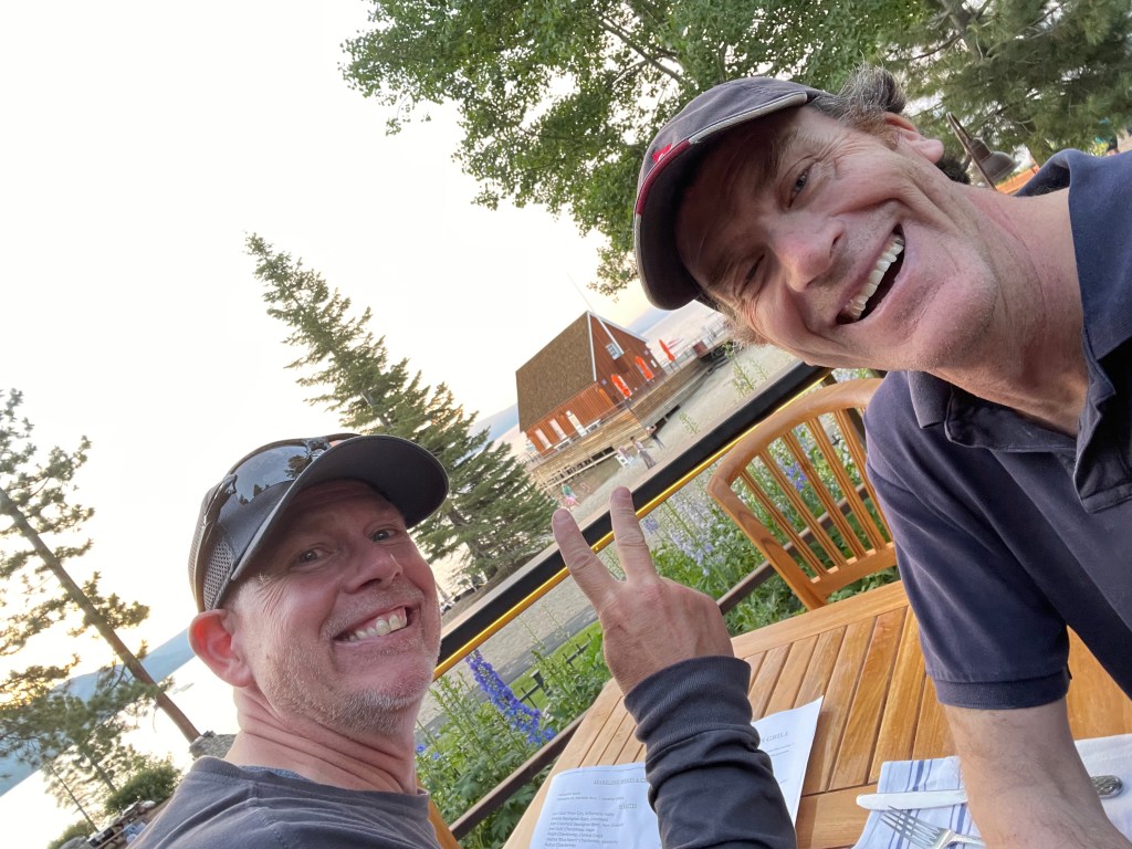 The good news is, we replaced the wonky thermostat. The better news is, my buddy Jamie and I discovered some Tahoe treasures, including a front-row seat at Chambers Landing Grill for an awesome sunset. I tucked into a veggie pizza and a Coors N/A, while Jamie devoured a plate of their amazing tacos and a crisp glass of Kim Crawford sauv blanc. Chambers was hopping with relaxed familes and lots of kids running around, climbing trees and playing paddle ball on the golden sand. The food was yummy, the service was outstanding (despite the fact that we had on Eau du Boat fragrance, two-day beards and grimy boat clothes, amidst the finery of the folks around us). The setting, of course, was pure summer Tahoe: pinkish light settling over the Sierras, the scent of warm sugar pines, and the sounds of happy families sharing stories and talking with their neighbors, largely vaxxed and relaxed, a prelude to a return to normalcy.