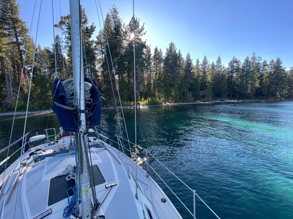 Meeks and Rubicon bays at Lake Tahoe offer some of the most exciting sailing, in my experience, and this summer has been no exception. This clip shows Splendido sailing close to the wind in 17-21 knots on an 84º F. afternoon about a week ago. I’d gone out for a fun afternoon of single-handed sailing as Debbie had some business to take care of in town, and then I decided to boat camp after this heart-pounding reach south toward Rubicon Bay.