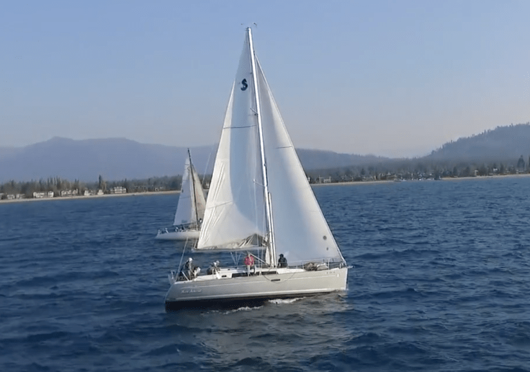 While nothing catastrophic happened (thank you, universe) other than someone stealing our buoy tags, we did have some lively moments, like when the sail slides on the mast all blew out right after I’d hoisted the main. In an instant, our mainsail turned into a wildly flapping spinnaker. Fortunately, I was able to pull it down quickly and continued sailing under genoa alone up to Tahoe City Marina, where you could not buy — at any price — a damn sail slide. (I now have enough backup sail slides to take care of two future blow-outs, thanks to our friends at Sailrite.) Oddly enough, a week later, that very same failure happened to John Turner aboard Grand Cru. The lesson here is that things age quickly at Lake Tahoe’s 6,225-ft. elevation, especially plastic sail slides. Back in my garage, it took me about four hours to sew on the new sail slides and shackles (another interesting lesson: I thought sail slides all just attached via snaps or screws, but half of the sail slides on my main had to be laboriously hand-sewn on. That would be quite the PITA if you had to do it aboard a pitching sailboat at sea).