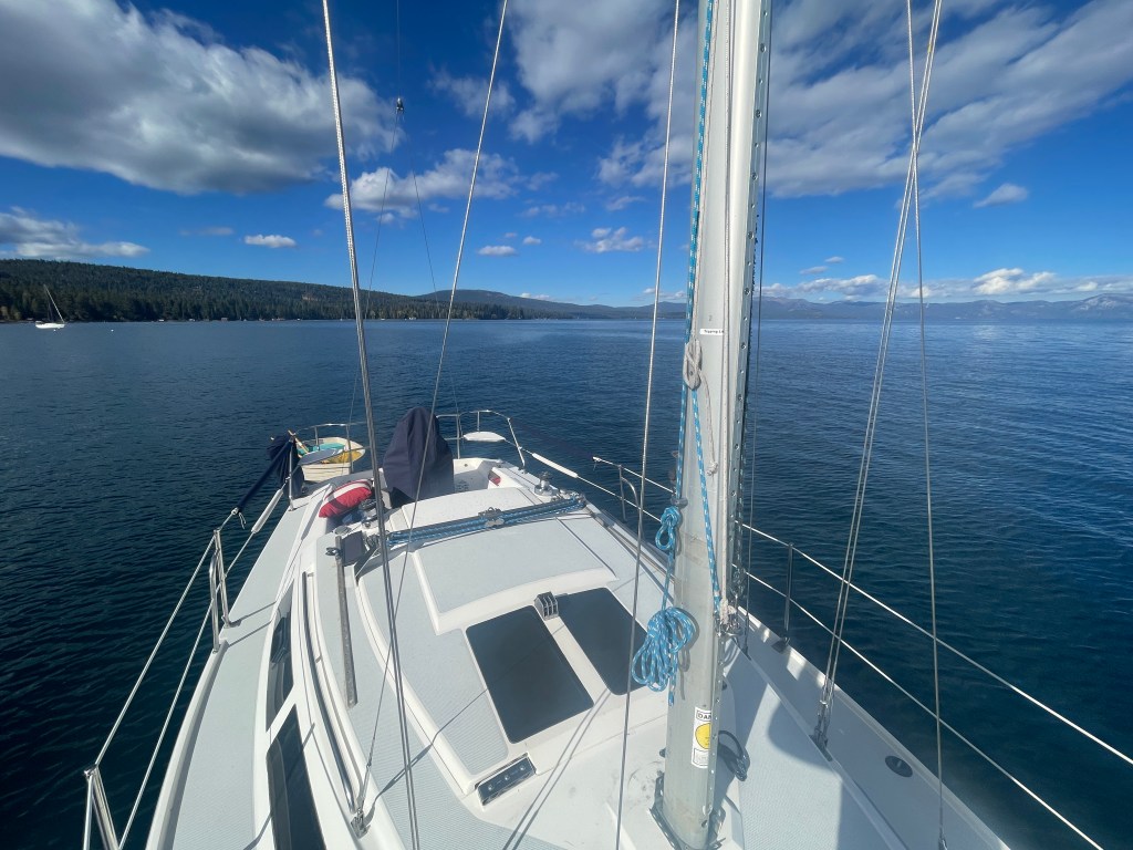I went up to the lake yesterday morning to prep Splendido for her haul-out scheduled for next Wednesday morning at Obexer’s. I motored north to Tahoe City Marina to do one final pump-out for the season, then enjoyed the view of the turning aspens intermixed with Tahoe’s gorgeous pines on the way back to our mooring at Skyland. I set a stopwatch and am proud to say that I was able to untape and pull all the cotter rings on the rigging, put the boom and mainsail in the cabin, and drop and bag the 150 genoa in two hours and six minutes — literally singlehandedly, since my left wrist is in a splint from coming off my dirt bike earlier this summer. As I was wrapping up, a solitary efoiler with a visible microphone in his helmet carved lazy S-turns through our mooring field and waved as he passed Splendido, the last boat left on the hook. I can’t help but wonder if it wasn’t Zuckerberg himself. I mean, who else would have a microphone in their helmet? We’ll never know.